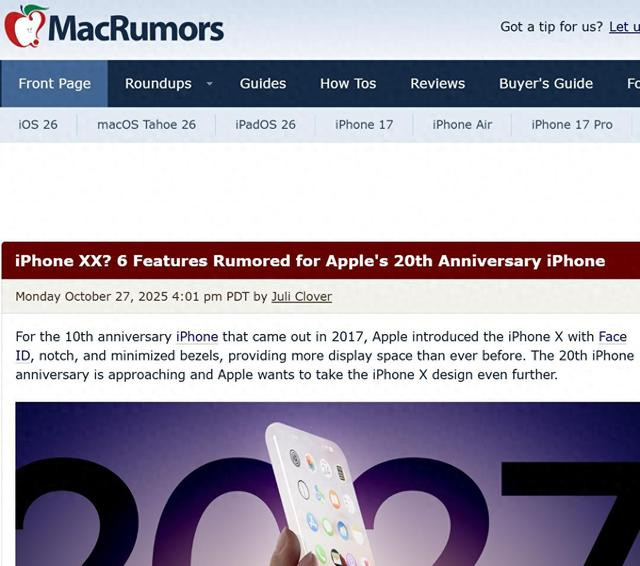 [环球网科技综合报道]10月28日消息,据macrumors报道称,2017年,苹果为庆祝iPhone十周年推出了iPhoneX,凭借面容ID、刘海和极窄边框设计,为用户带来了更大的显示空间。如今,随着iPhone20周年纪念日的临近,苹果有望在2027年推出一款全新的纪念版iPhone,这款设备可能会搭载六项令人关注的功能。